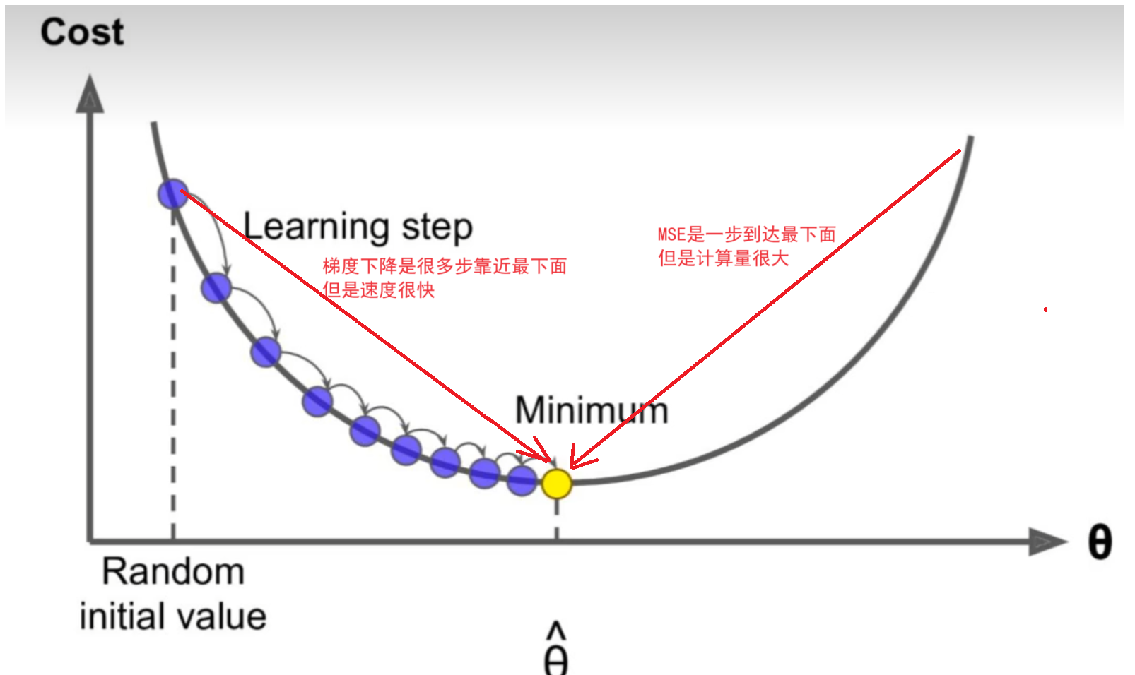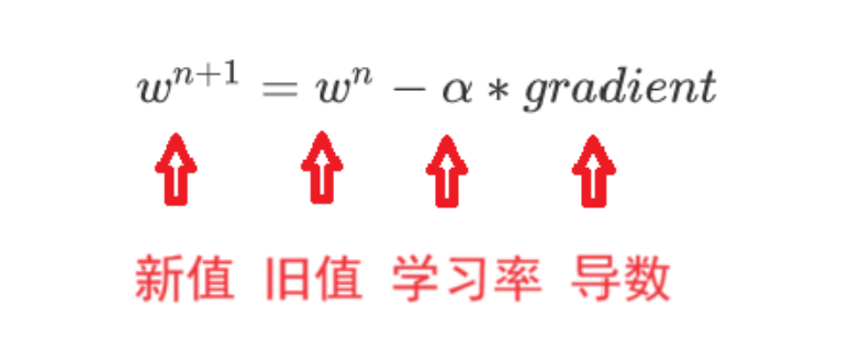 其中random initial value是随机初始化的起始值,也就是在初始化值开始寻找最小的梯度也就是导数。这幅图里只有一个回归系数w,其损失函数MSE就是一个抛物线。而抛物线一点作切线就是该点的梯度即导数,最优w梯度为0,左侧是负数,右侧是正数。而接下来,我们会一步一步往梯度为0的方向寻找w,直到达到收敛。(这里的梯度下降都是针对损失函数)