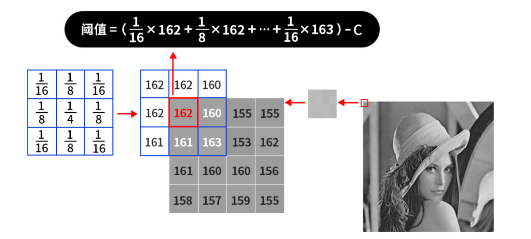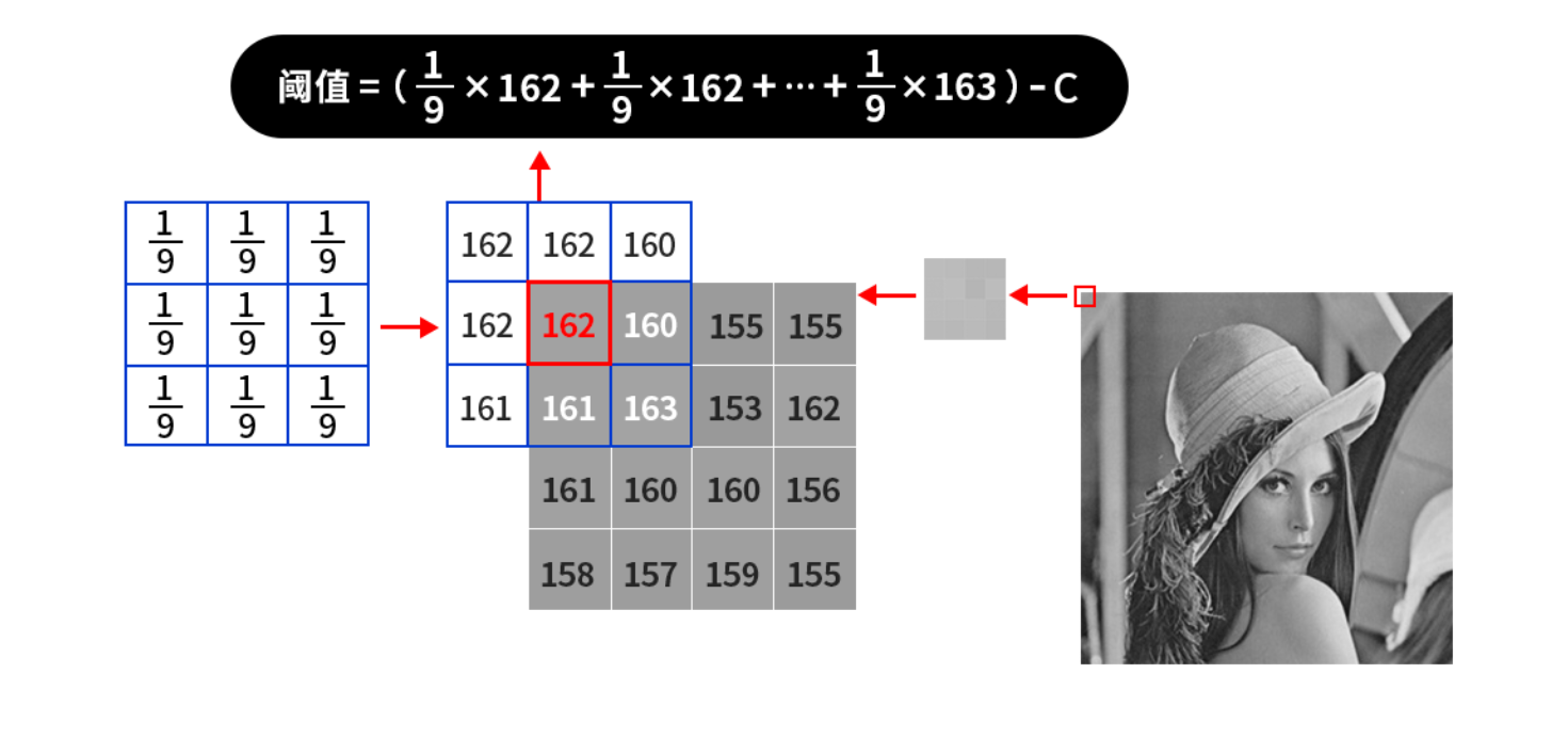 从图片的左上角开始计算其邻域内的平均值,用一个均值卷积核来实现,将卷积核中心对准要阈值处理的像素,然后计算这个卷积核内所有像素的平均值,最后减去常数C得到该点阈值。