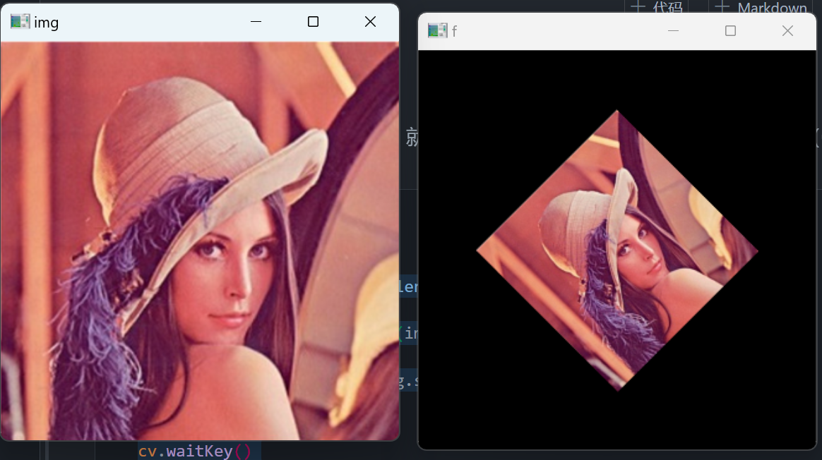 M = cv.getRotationMatrix2D((img.shape[1]/2,img.shape[0]/2),45,0.5) f = cv.warpAffine(img,M,(img.shape[1],img.shape[0])) cv.imshow('img',img) cv.imshow('f',f) cv.waitKey() cv.destroyAllWindows()