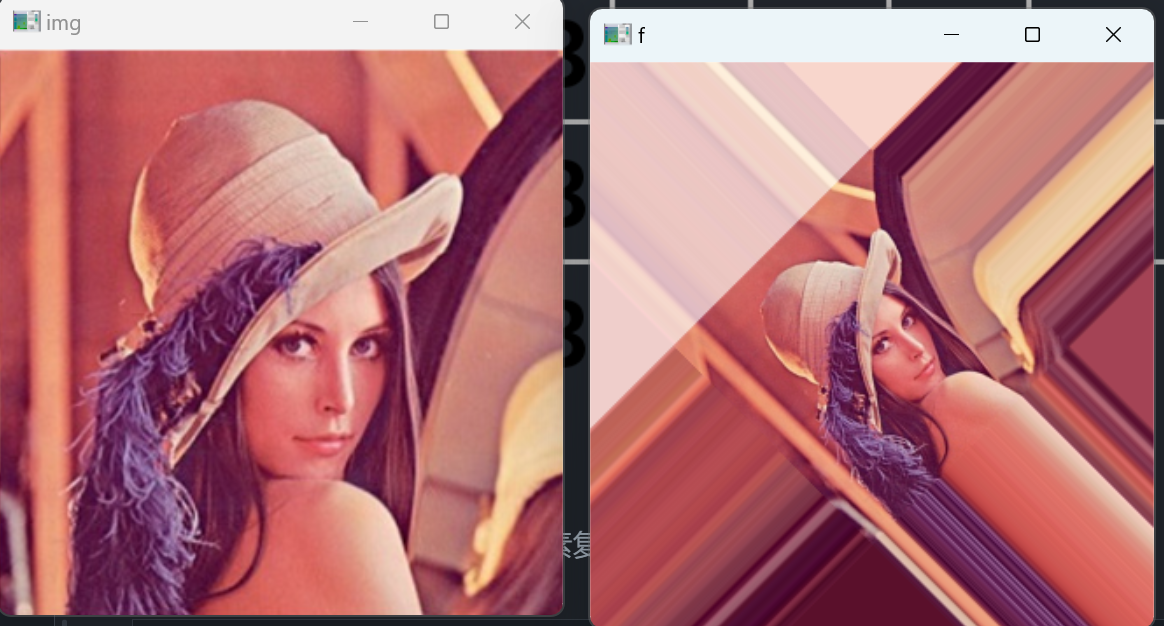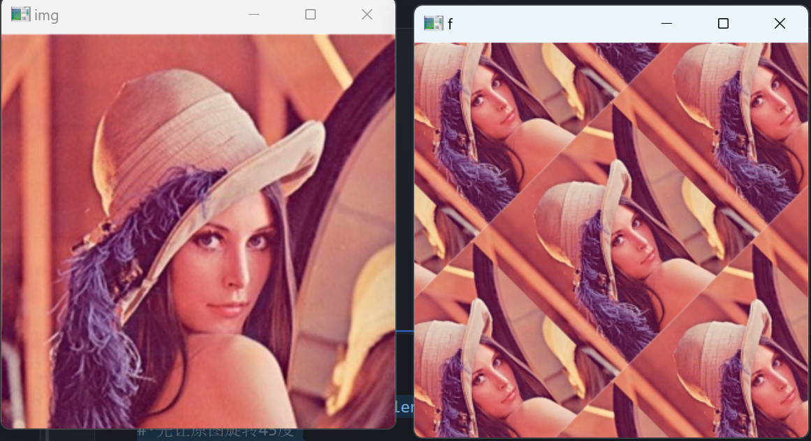 M = cv.getRotationMatrix2D((img.shape[1]/2,img.shape[0]/2),45,0.5) f = cv.warpAffine(img,M,(img.shape[1],img.shape[0]),borderMode=cv.BORDER_WRAP) cv.imshow('img',img) cv.imshow('f',f) cv.waitKey() cv.destroyAllWindows()