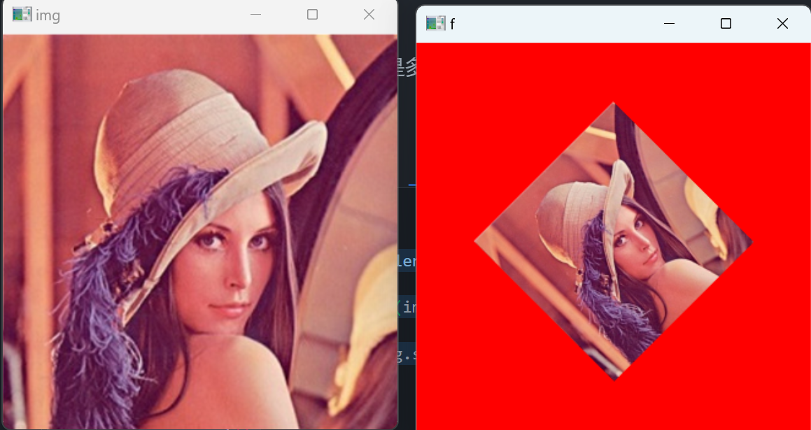 M = cv.getRotationMatrix2D((img.shape[1]/2,img.shape[0]/2),45,0.5) f = cv.warpAffine(img,M,(img.shape[1],img.shape[0]),borderMode=cv.BORDER_CONSTANT,borderValue=(0,0,255)) cv.imshow('img',img) cv.imshow('f',f) cv.waitKey() cv.destroyAllWindows()