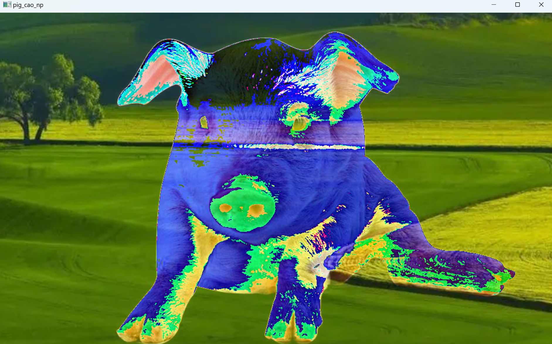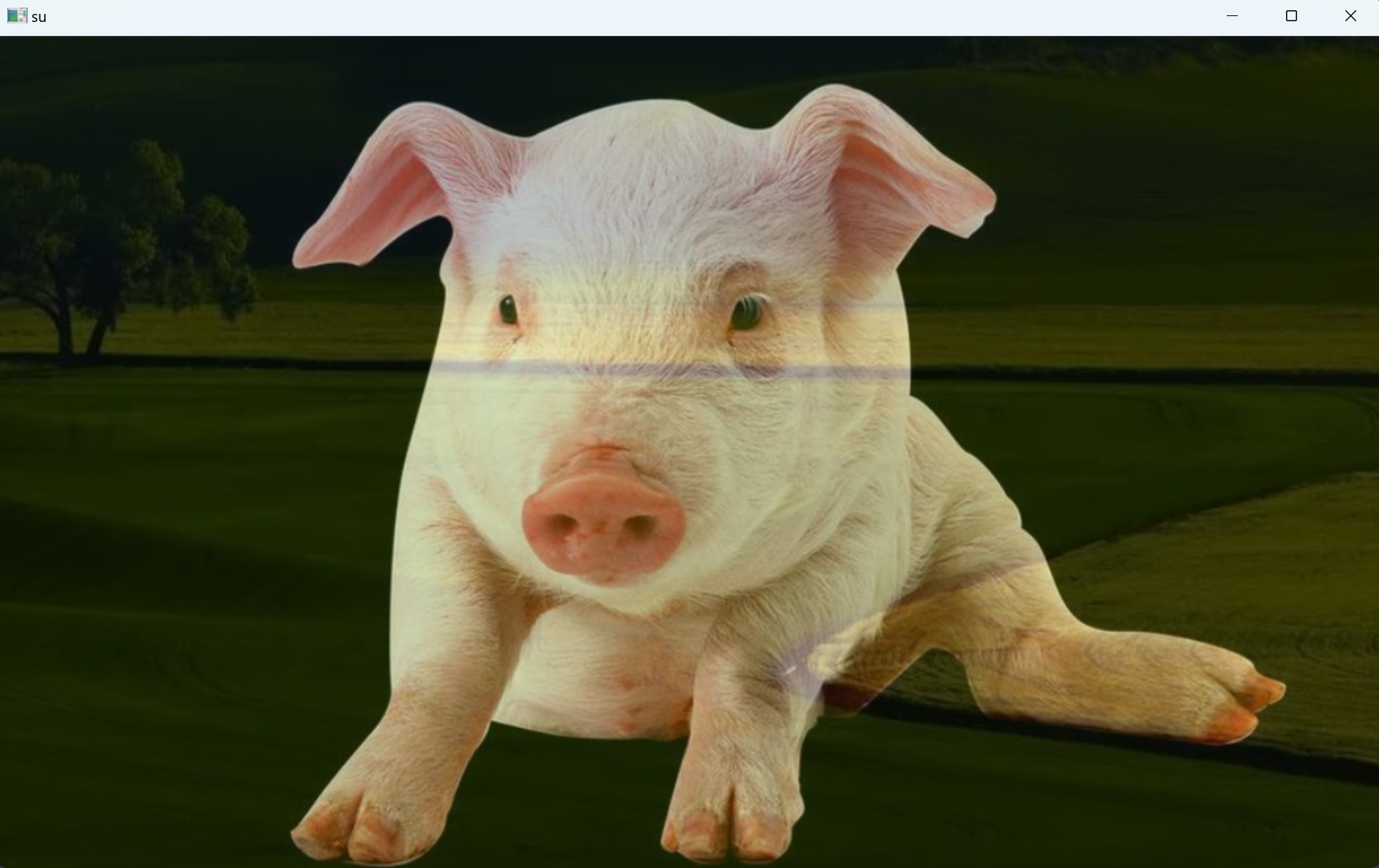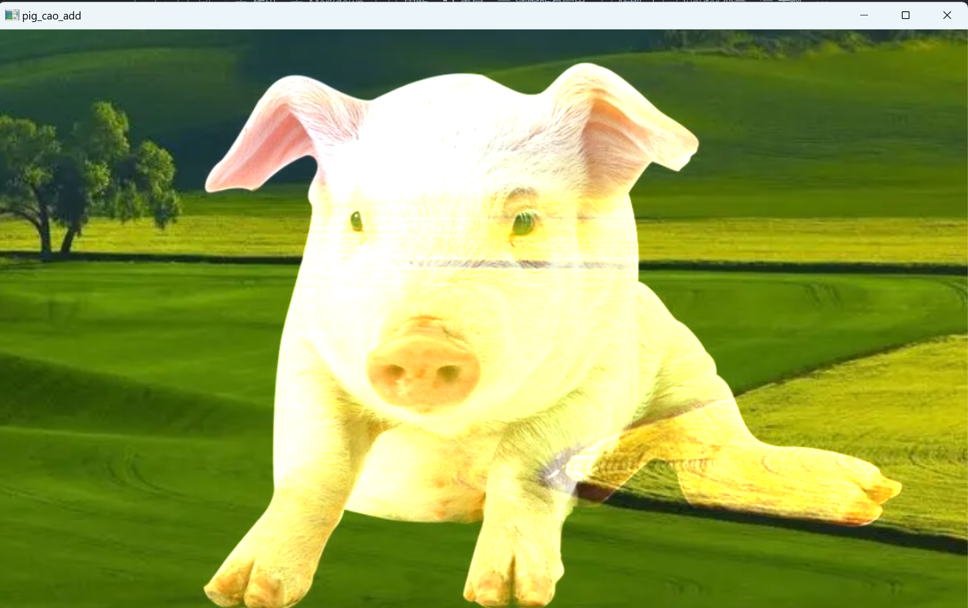 | import cv2 as cv import numpy as np pig = cv.imread('../images/pig.png') cao = cv.imread('../images/cao.png') su = cv.addWeighted(pig, 0.7, cao, 0.3, 0) cv.imshow('su',su) cv.waitKey() cv.destroyAllWindows()