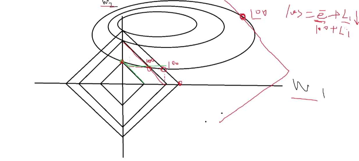 可以看到,lasso回归进行正则化的原理实际也是在同等损失下,让惩罚性更小,这个取值的点一般都在坐标轴上,因为此时惩罚项是最小的。但是我们实际的目的是让loss下降,所以在w的取舍下,会优先考虑让损失下降,而非先考虑惩罚性的下降(loss的数量级更高)。不过即使这样考虑,损失依然会有一些上升,这是考虑正则项的必然。