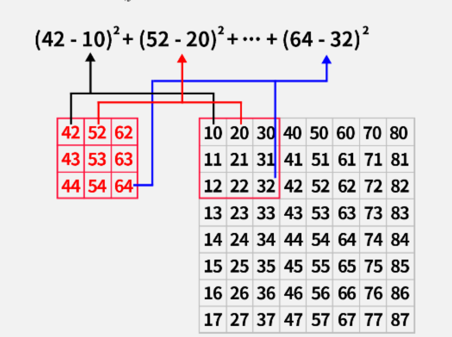 以模板图与目标图所对应的像素值使用平方差公式来计算,其结果越小,代表匹配程度越高。如图: