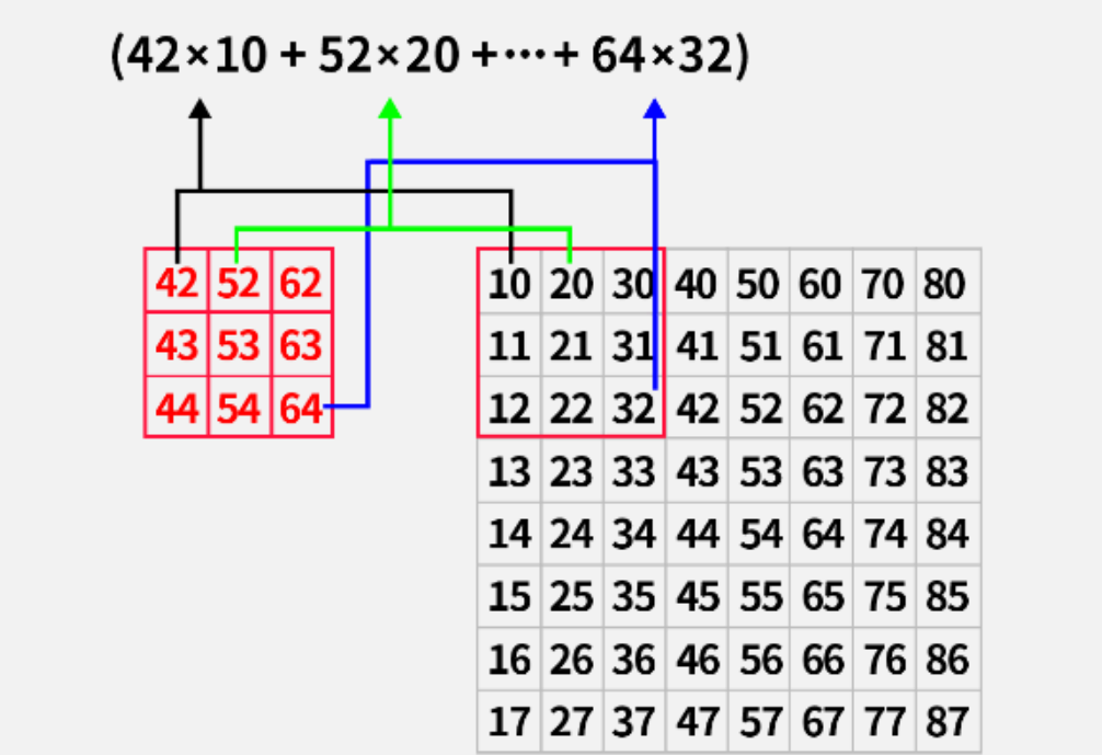 使用对应像素的乘积进行匹配,乘积的结果越大其匹配程度越高。如图:
