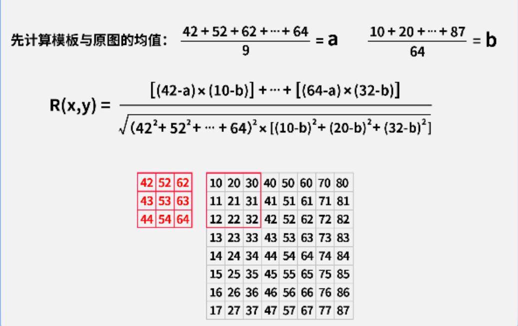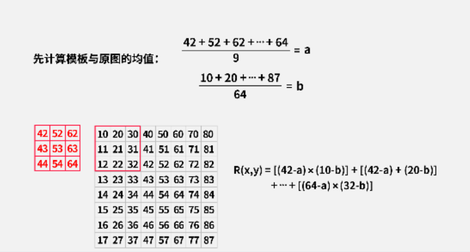 先计算模板与目标图像的均值,然后通过每个像素与均值之间的差的乘积再求和来表示其匹配程度,1表示完美的匹配,-1表示最差的匹配。如图: