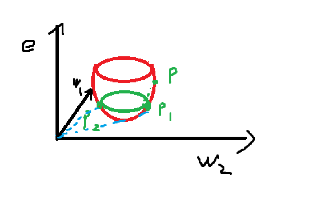 上图以L2正则化为例,蓝色虚线直观体现正则化的作用。由p点进行梯度下降到P1,没有正则化就会到此为止。加入L2正则化后,其会选择更靠近原点的P2,使得w向量更小。
