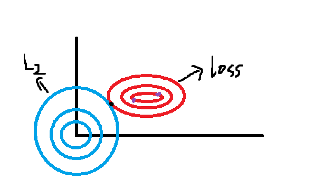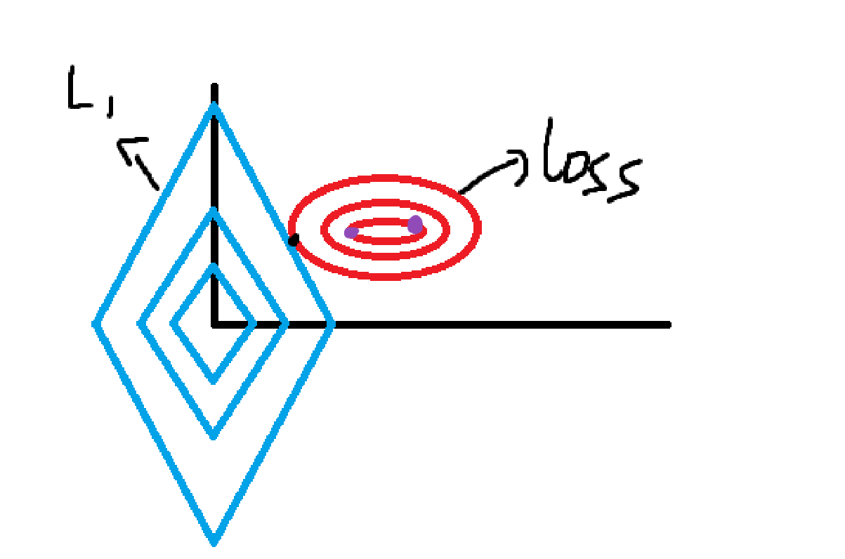 图中横纵坐标轴是w1,w2,蓝色就是L2与L1正则化的函数图像,等高线是损失函数loss,紫色是loss相同的两点。我们的目的是让loss加正则化函数的整体变小,那两个函数都得尽量小,成反比的两个函数值就得达到一个平衡点,也就是两个函数图像相交的点,到两个图像的中心即原点和等高线最低点都要尽可能的近。那么显而易见,我们就会选择更靠向原点的紫色点。