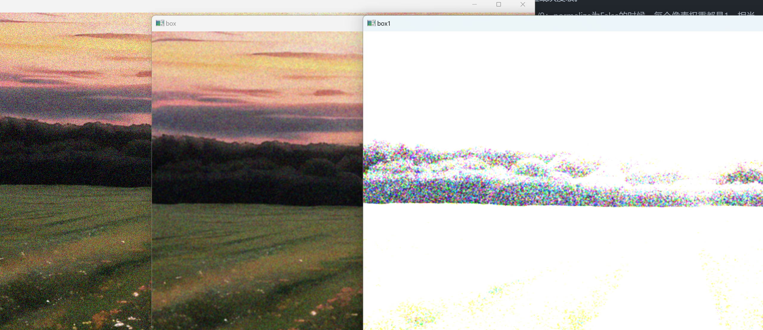 - normalize:当normalize为True的时候,方框滤波就是均值滤波,权重就等于1/9;normalize为False的时候,每个像素权重都是1,相当于求区域内的像素和,超出部分做取模运算。
