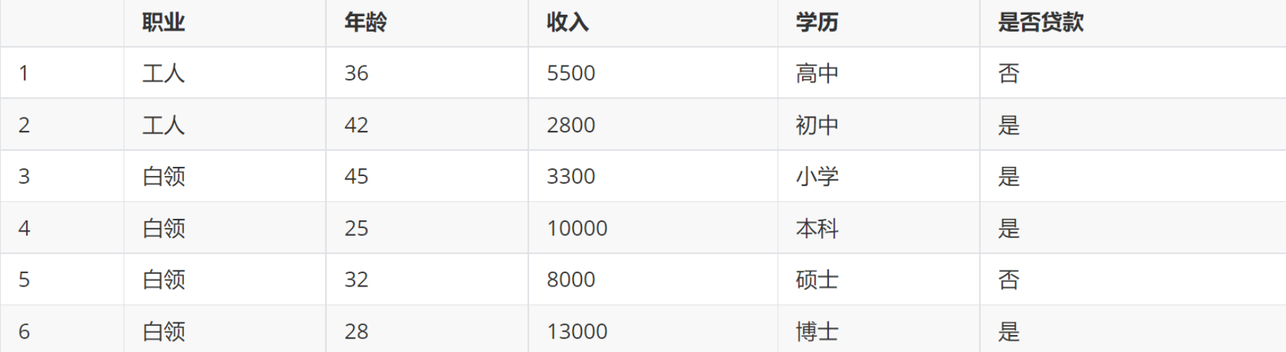 对比属性信息增益发现,”收入”和”学历”相等,并且是最高的,所以我们就可以选择”学历”或”收入”作为第一个决策树的节点(这里是把学历分为两类,如果就直接分类的话,那么每种学历都得单独计算信息增益且可能会单独作为一个决策节点)