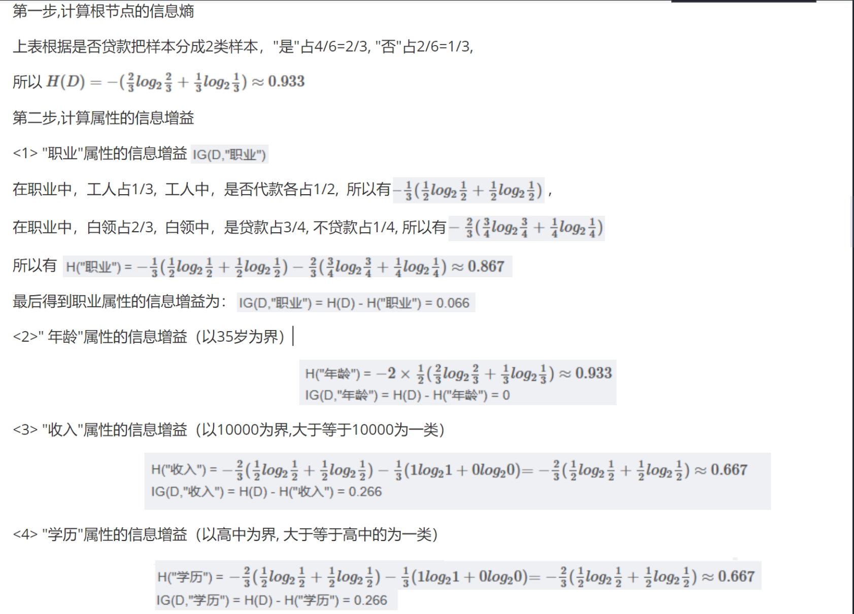 也就是说,先得算标签的信息熵,然后再计算用某个特征区分标签的信息熵,最后再作差。