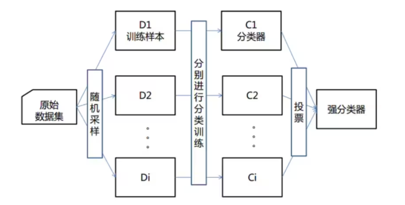 每次有放回地从训练集中取出 n 个训练样本,组成新的训练集;